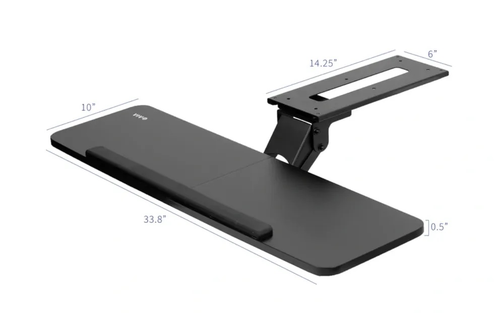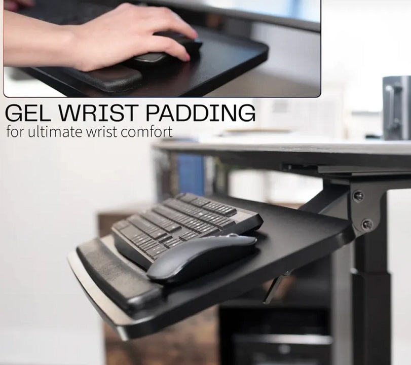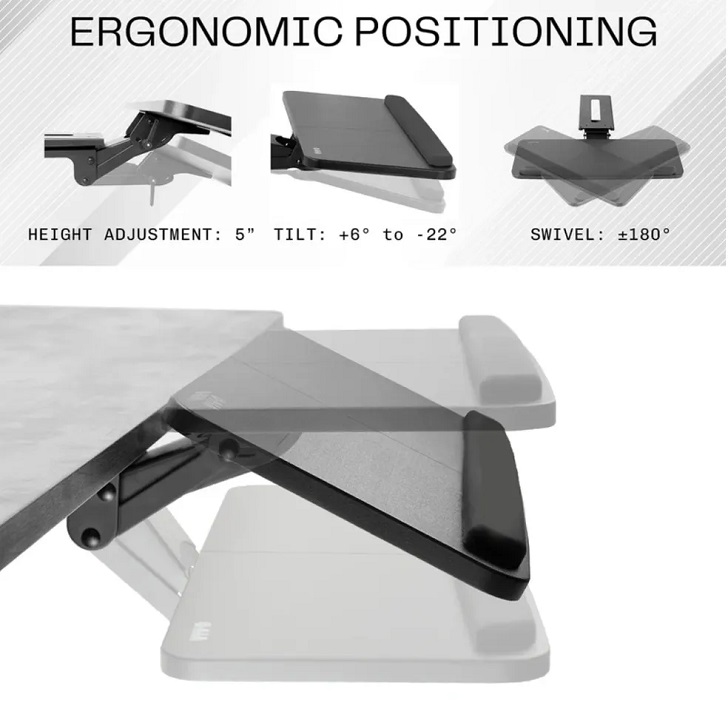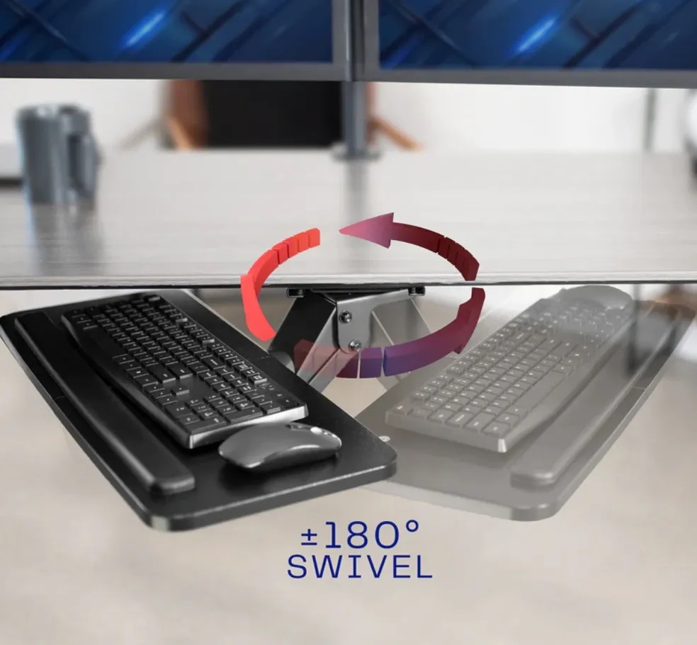 Enhance your typing posture with an ergonomic adjustable keyboard tray that mounts to the underside of your desk. Features include plush wrist padding to help reduce wrist soreness, height adjustment within a 5” range, and full side-to-side rotation for optimal keyboard placement.