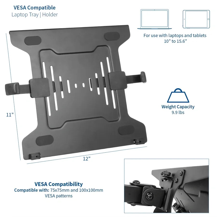 This adjustable tray attaches to your current compatible monitor mount (VESA 75x75mm and 100x100mm) and holds a laptop 10” to 15.6” in size. Raising your device to an ergonomic position reduces strain on your back, neck, and eyes. The design include ventilation slots to provide excellent airflow for sufficient cooling.