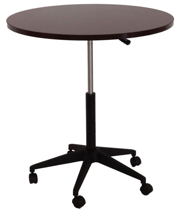 32 inch Mobile Round Table in rich, sophisticated Mahogany. It is constructed of thermal fused melamine with 3mm PVC edge banding, which offer excellent durability and scratch resistance. It comes with a 1 inch thick top that provides a sturdy surface that will require little maintenance. This unit comes with easily adjustable pneumatic gas lift height adjustment, to help you find the personalized height that suits you and your environment. The nylon base provides added stability to the table by spreading the load over a larger surface area. The hooded double wheel casters make it easy to move and shift directions. This item ships in two cartons.