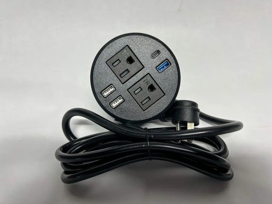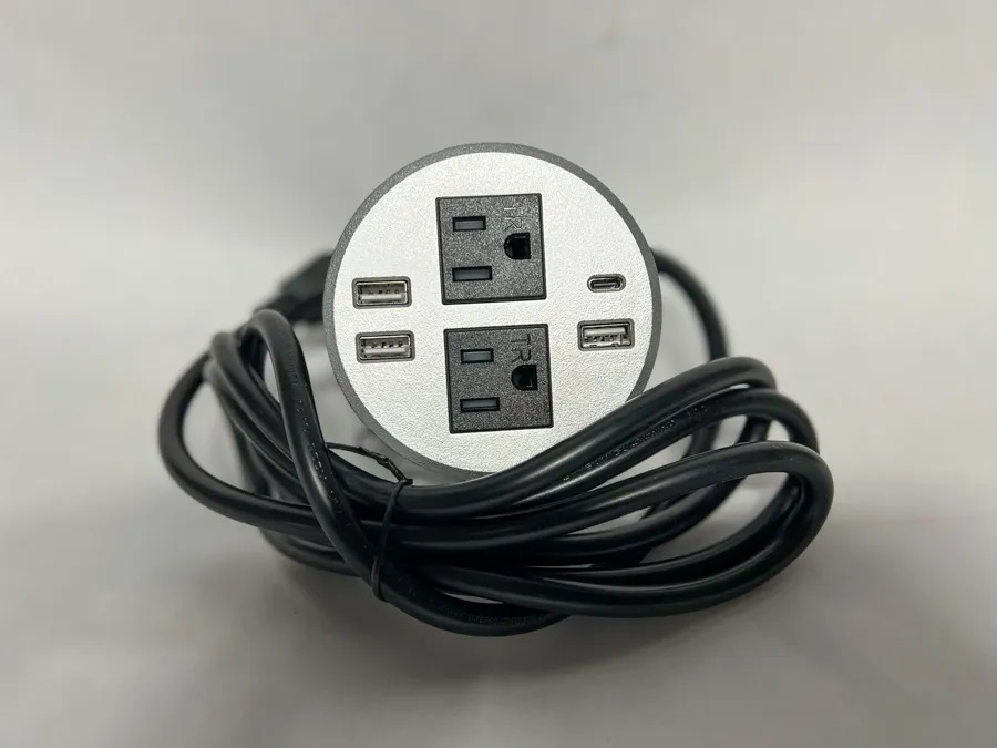 This desktop power grommet is the perfect addition to any desktop, from sit/stand workstations to traditional stationary work surfaces. Fitting a standard grommet hole, it makes efficient use of a typically wasted bit of desktop by packing two AC outlets, three USB ports, one USB-C port and an additional AC outlet on the bottom for daisy linking up to four units. AC outlets are TR to protect employees from shock and prevent tampering. The power cord is 6’4” long. ETL certified. Available in Silver face plate with Black outlets & Black face plate with Black outlets. Measures 3 1/8” in diameter.