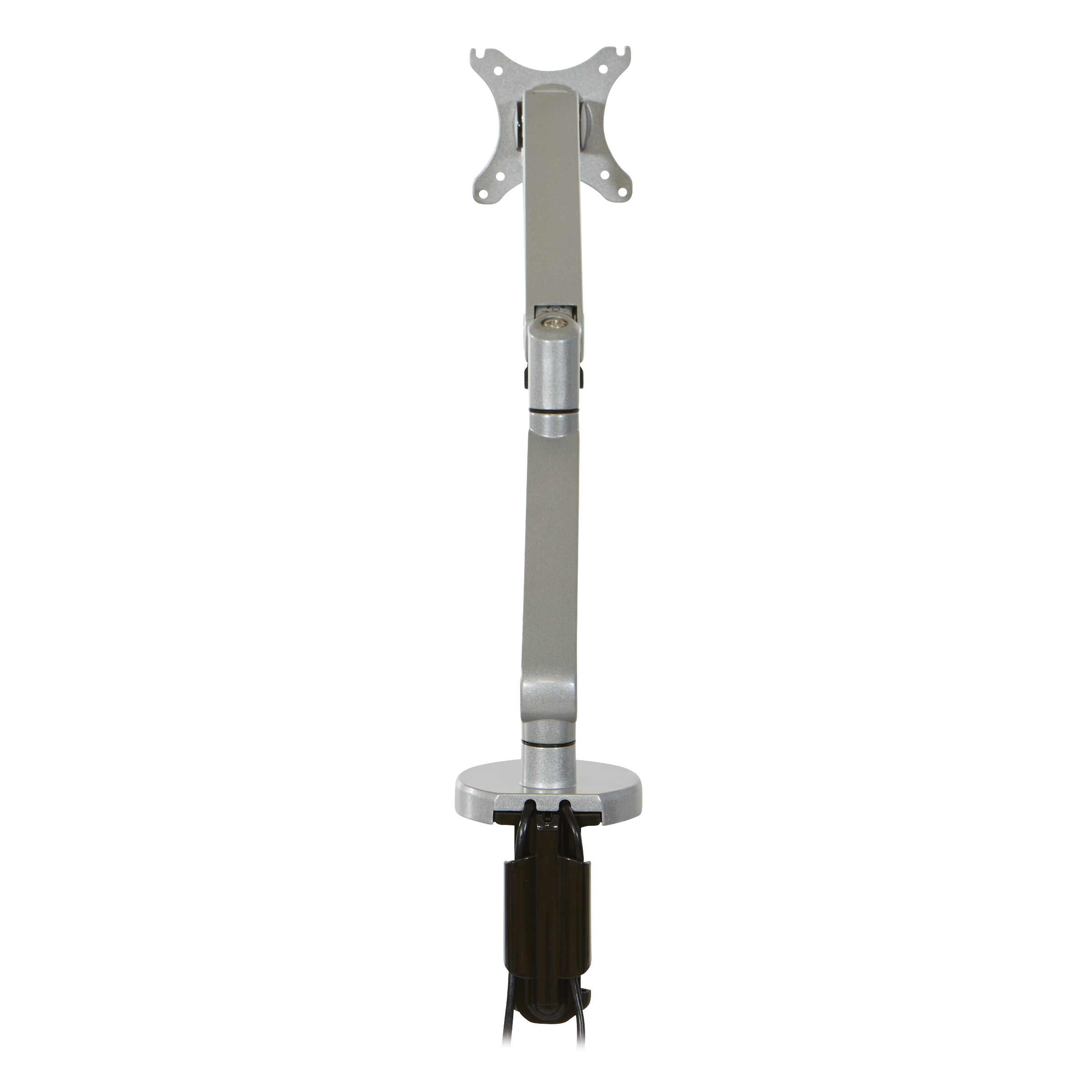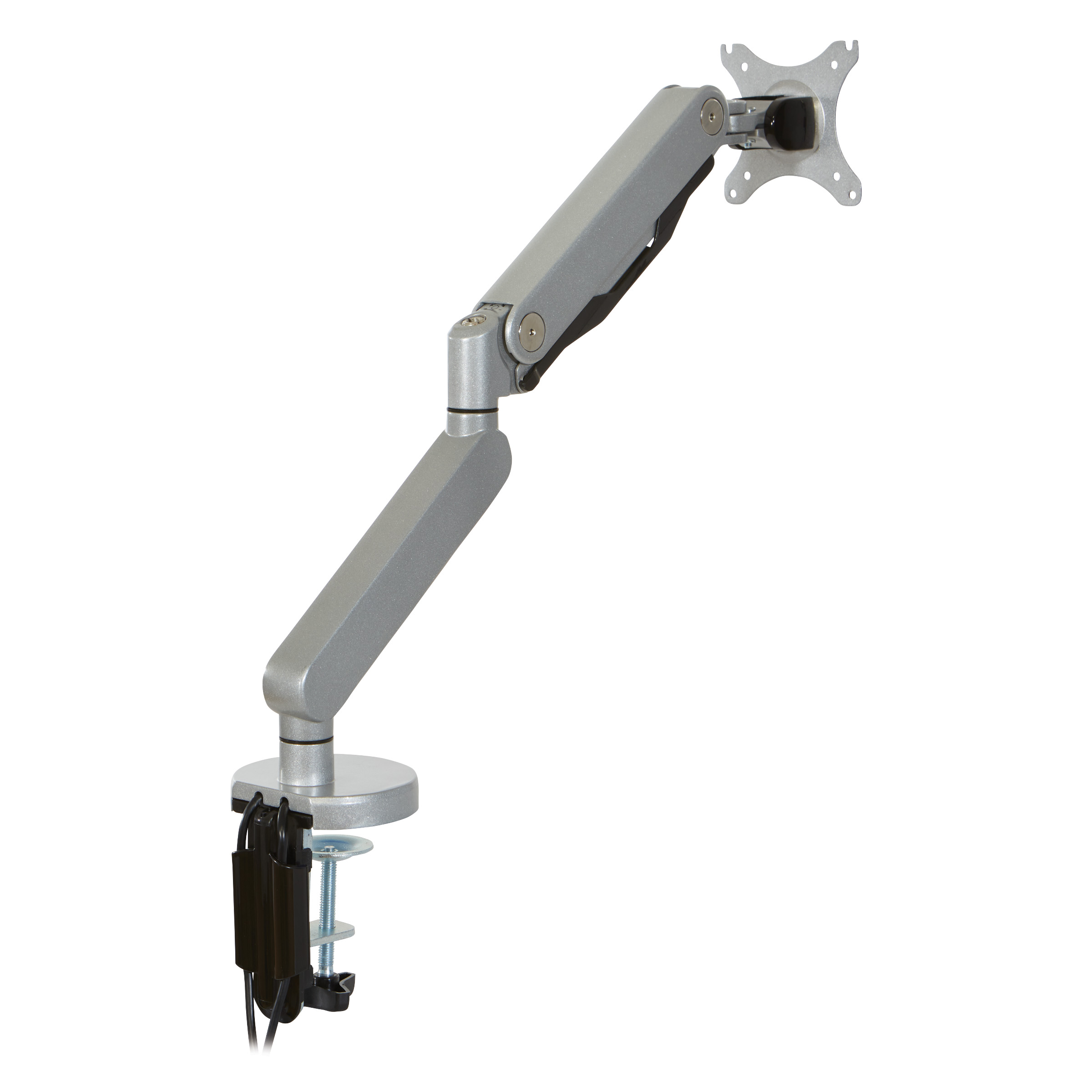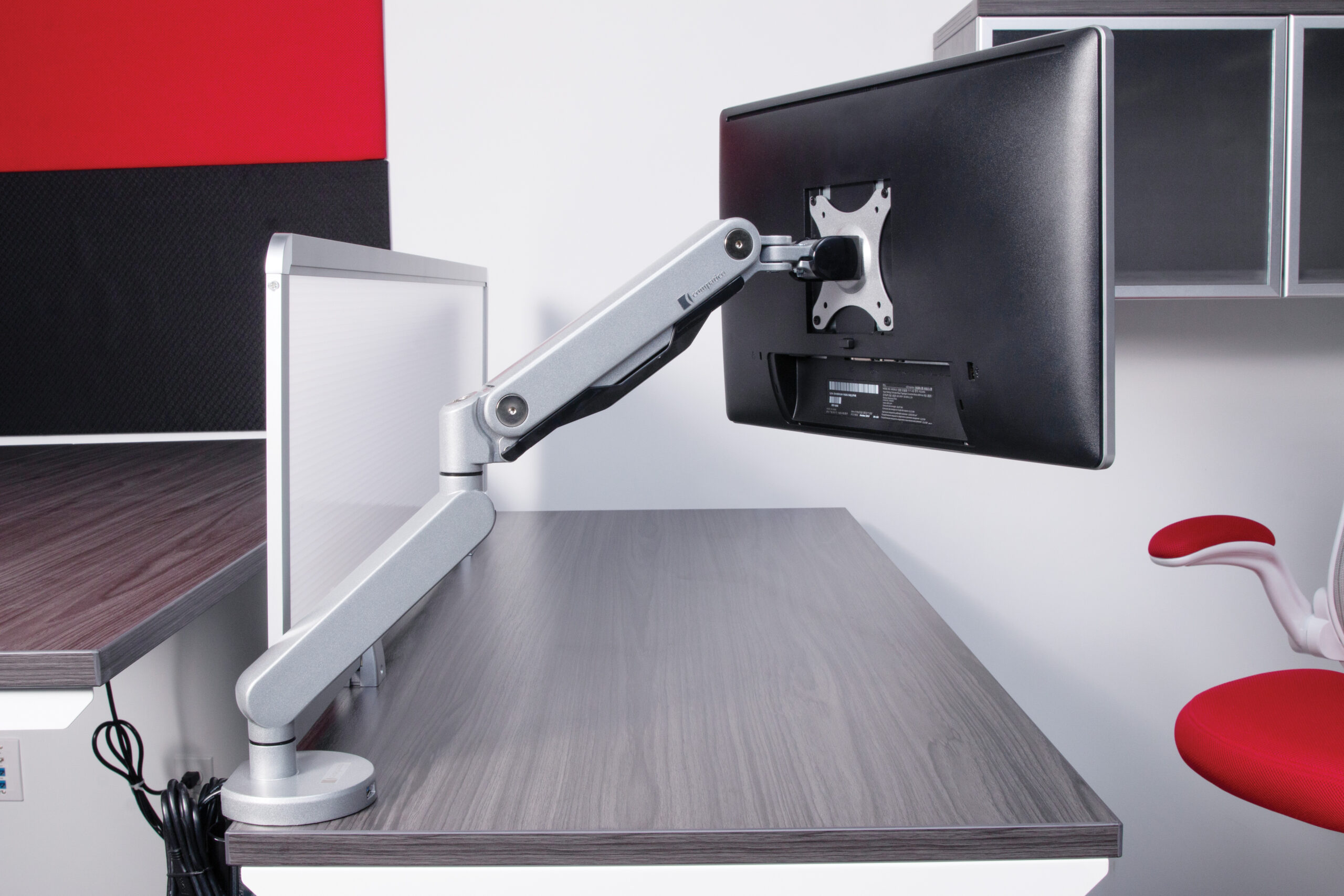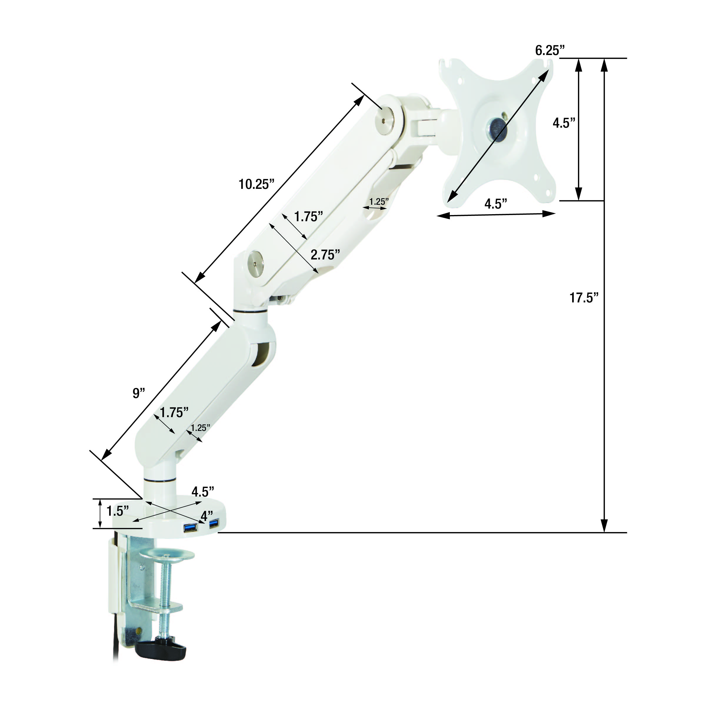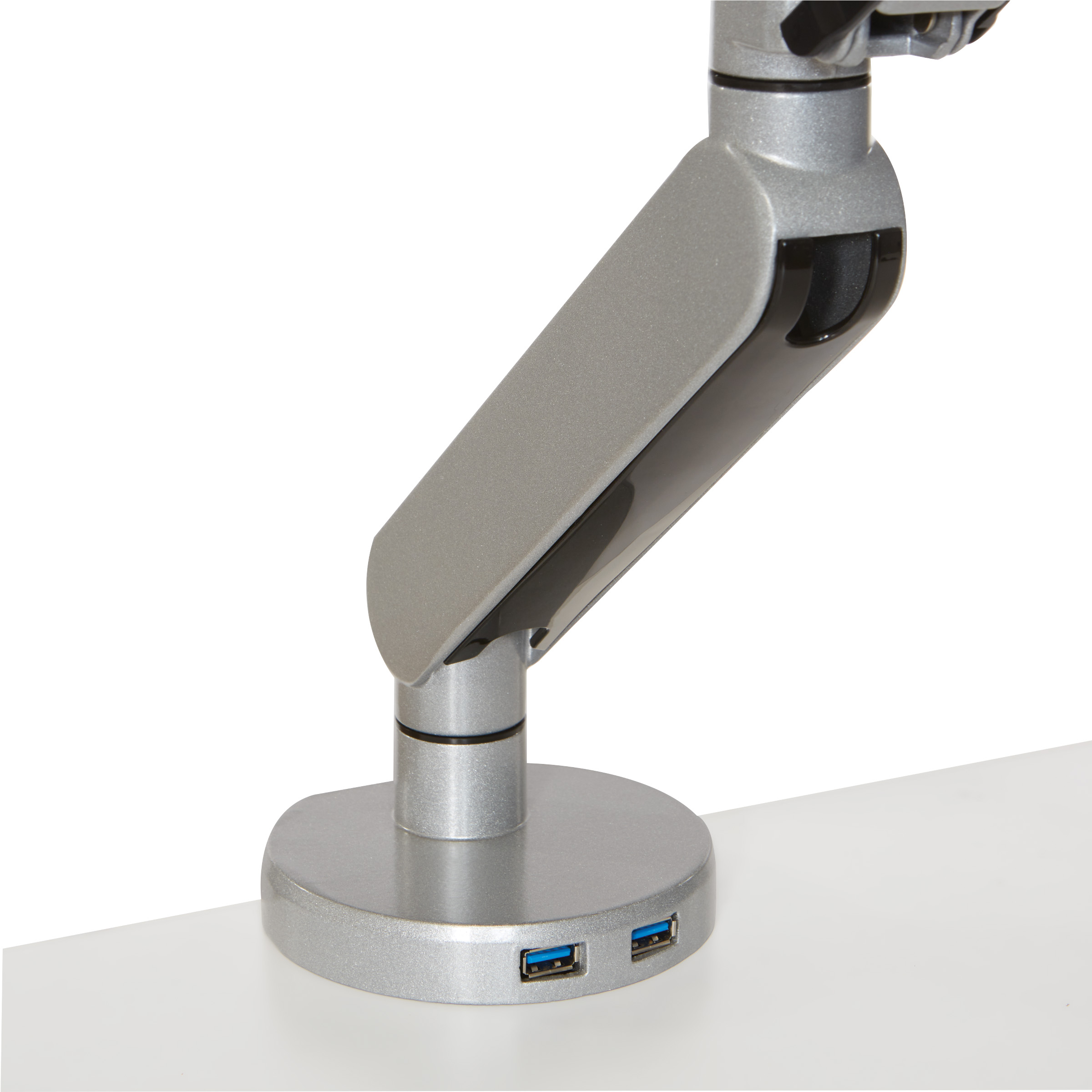 Gas-assisted monitor arm with 3-point adjustment further individualize workplace ergonomics.  Arms support 17″-30″ monitors.  Base includes dual USB 3.0 ports within easy reach